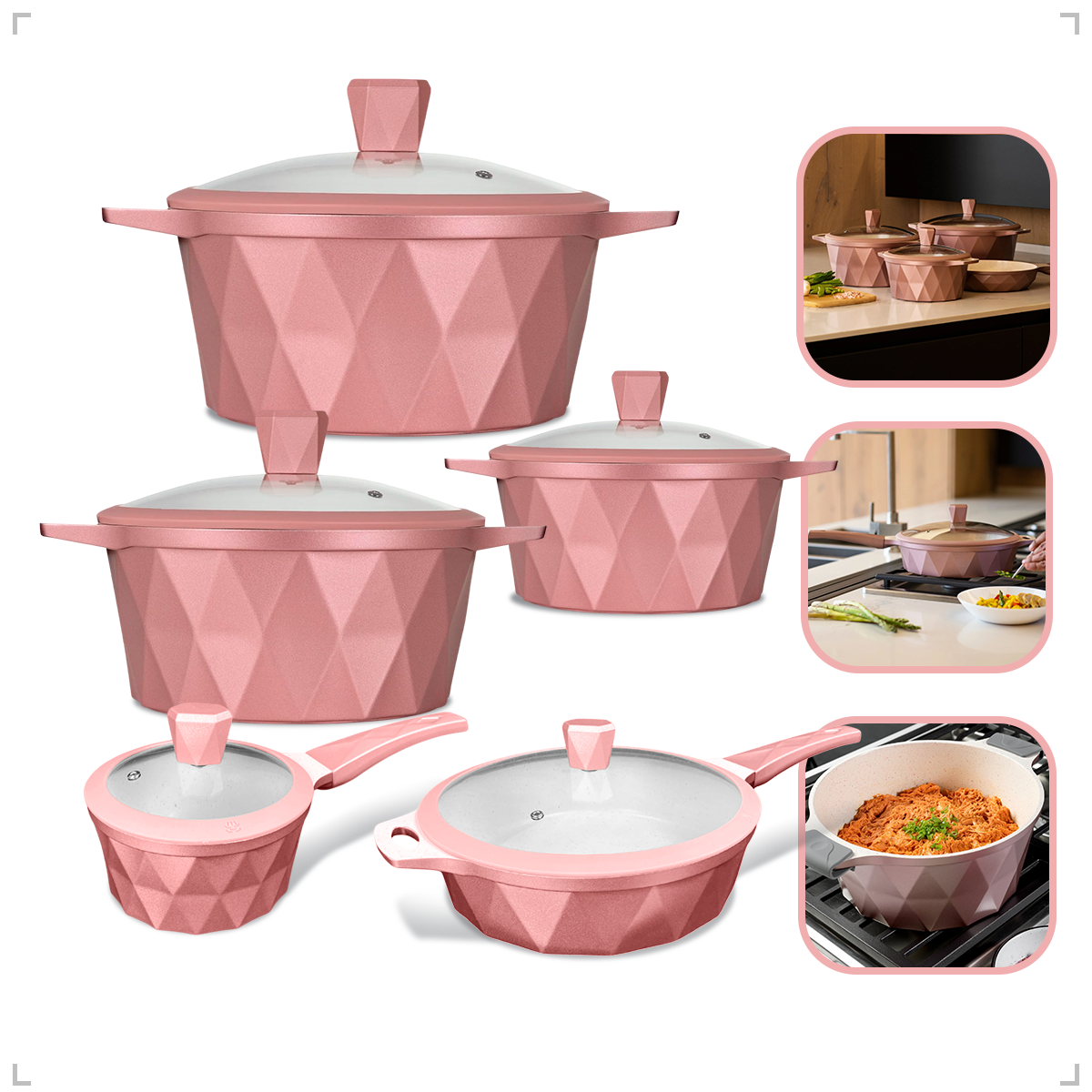 - Inclui uma variedade de tamanhos de panelas e frigideiras para atender a todas as necessidades culinárias.